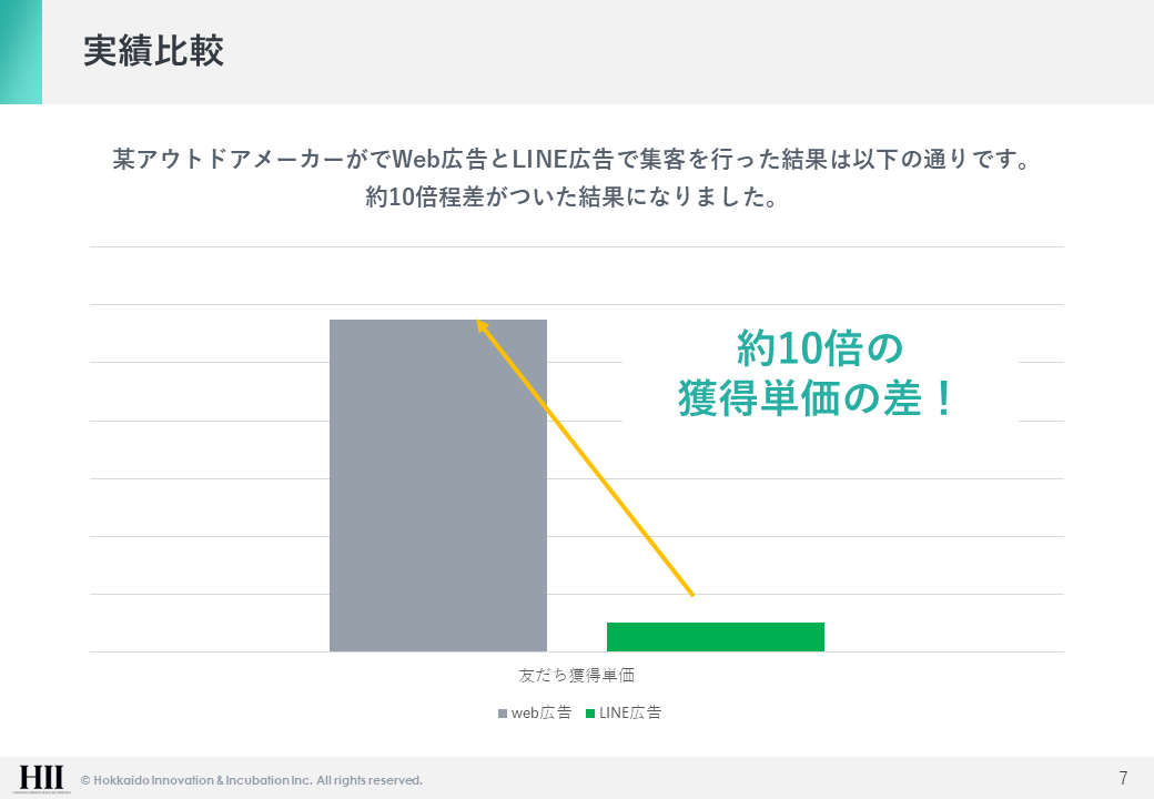 具体的には、LINE広告を使用した場合、ユーザー一人あたりの獲得費用がWeb広告の約1/10に抑えられたという結果です。