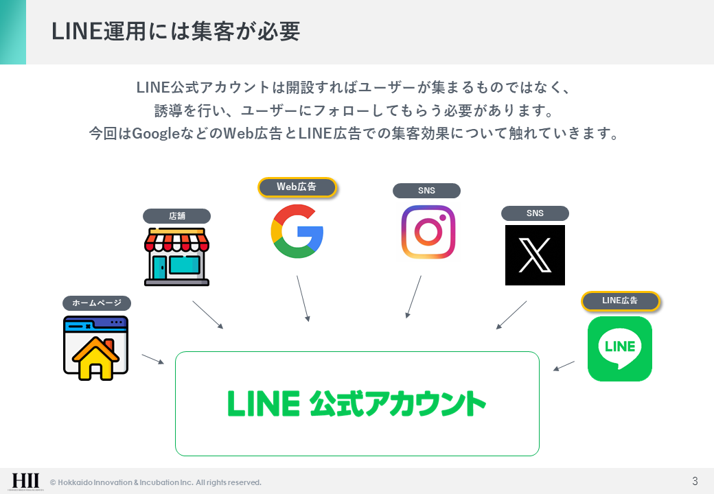 まず、LINE公式アカウント運用を行う上では、集客する事が大事になってきます。InstagramやX(Twitter)では、コンテンツが拡散され、ユーザーが増える仕組みなっていますが、LINE公式アカウントでは企業自ら登録を促進する必要があります。