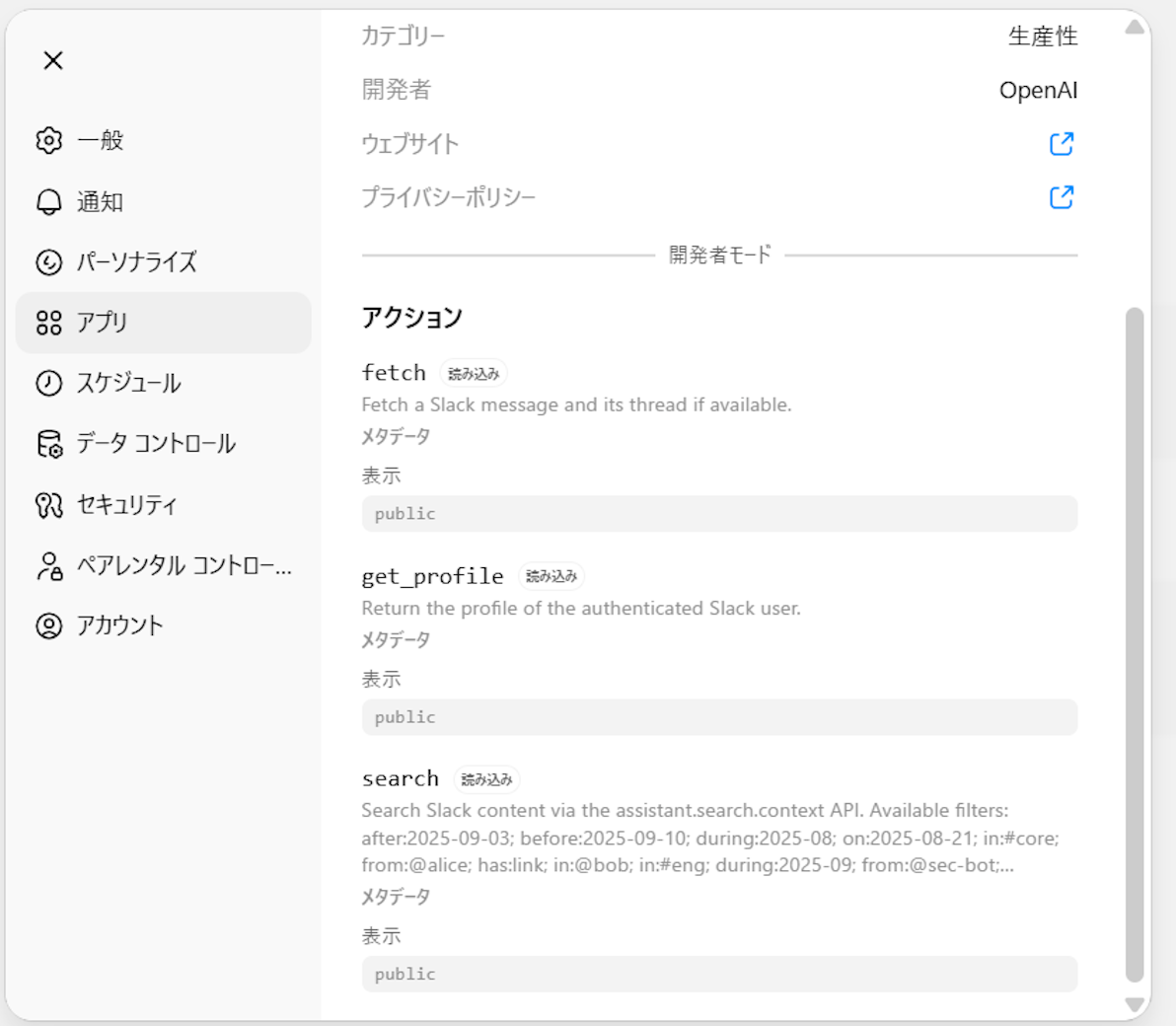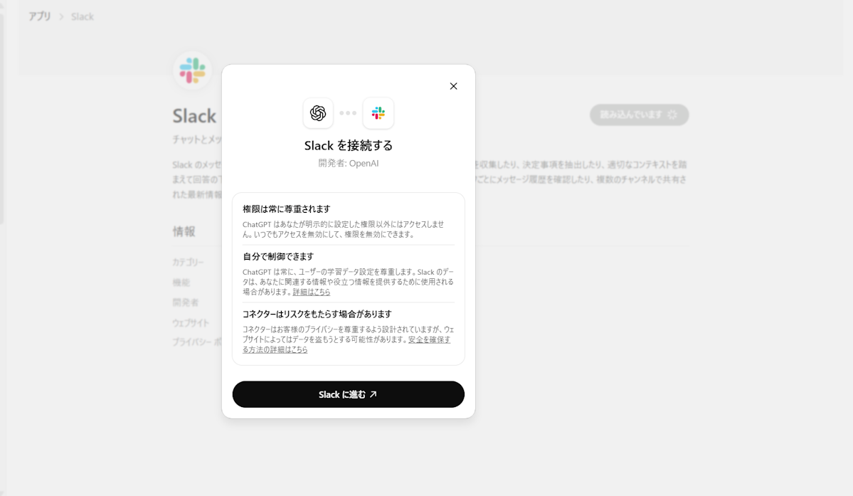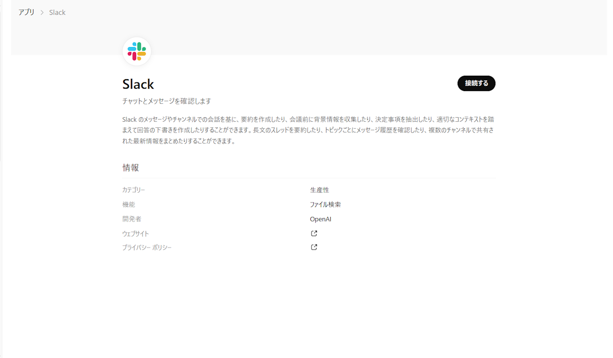 これはあくまでChatgptが提供しているSlackアプリ(MCP)であり、個別にMCPを作る事で、AIがSlackのデータを読み取って、Slackにメッセージを送るなどは可能になります。