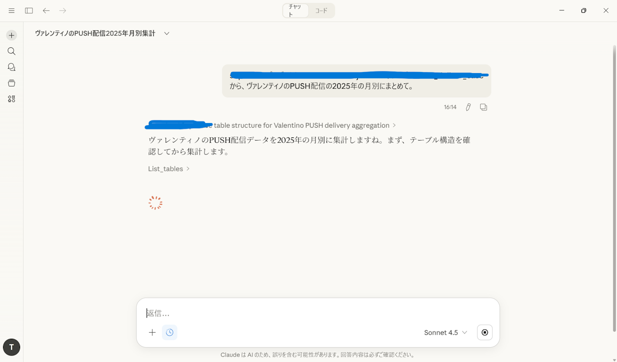 claudeには、弊社が開発したMCPを繋げており、先述したようにChatgptが提供しているアプリ(MCP)とは異なり、様々な事が出来るようになっています。