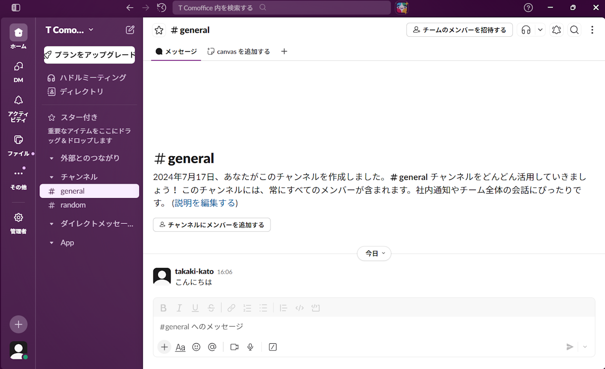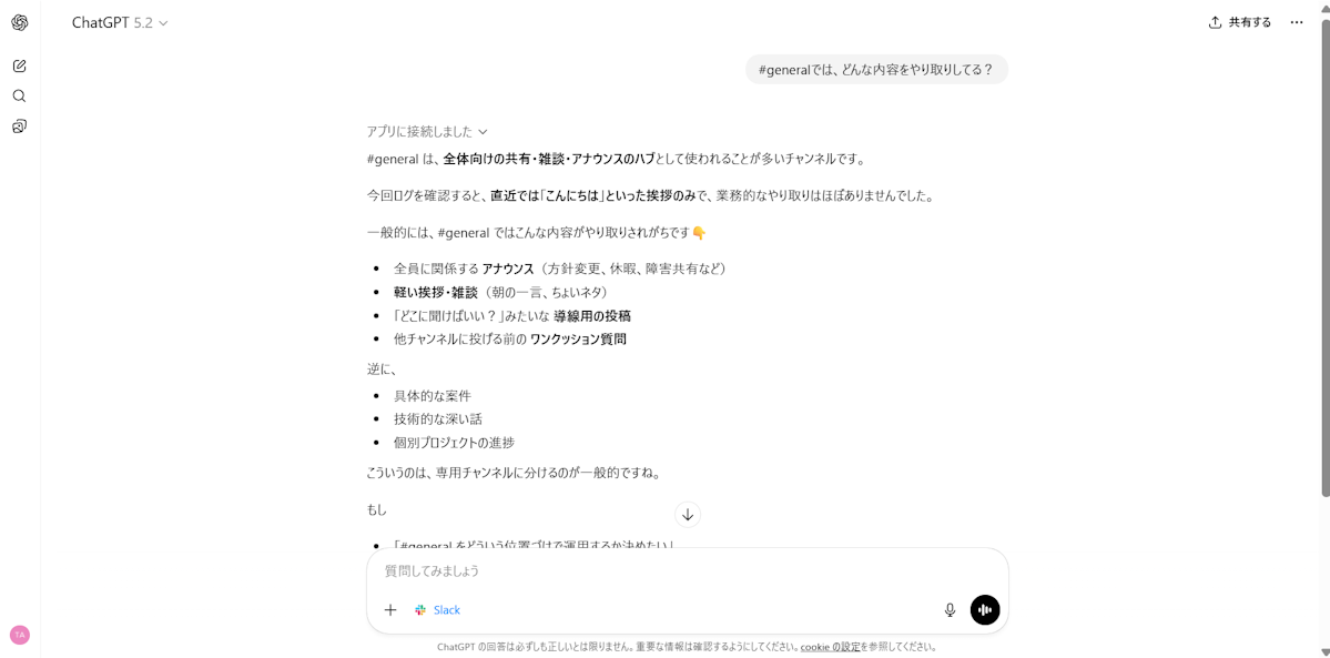 以下は、「general」というSlackのチャンネルで、「こんにちは」と打っただけでの内容ですが、chatgptと連携するとその内容を取得する事が出来ました。