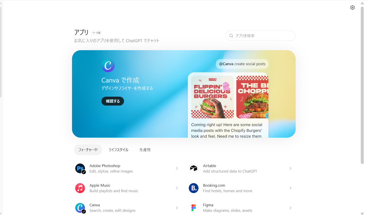 chatgptでは、外部の様々なツールやシステムと連携する「アプリ」という機能が実装されています。