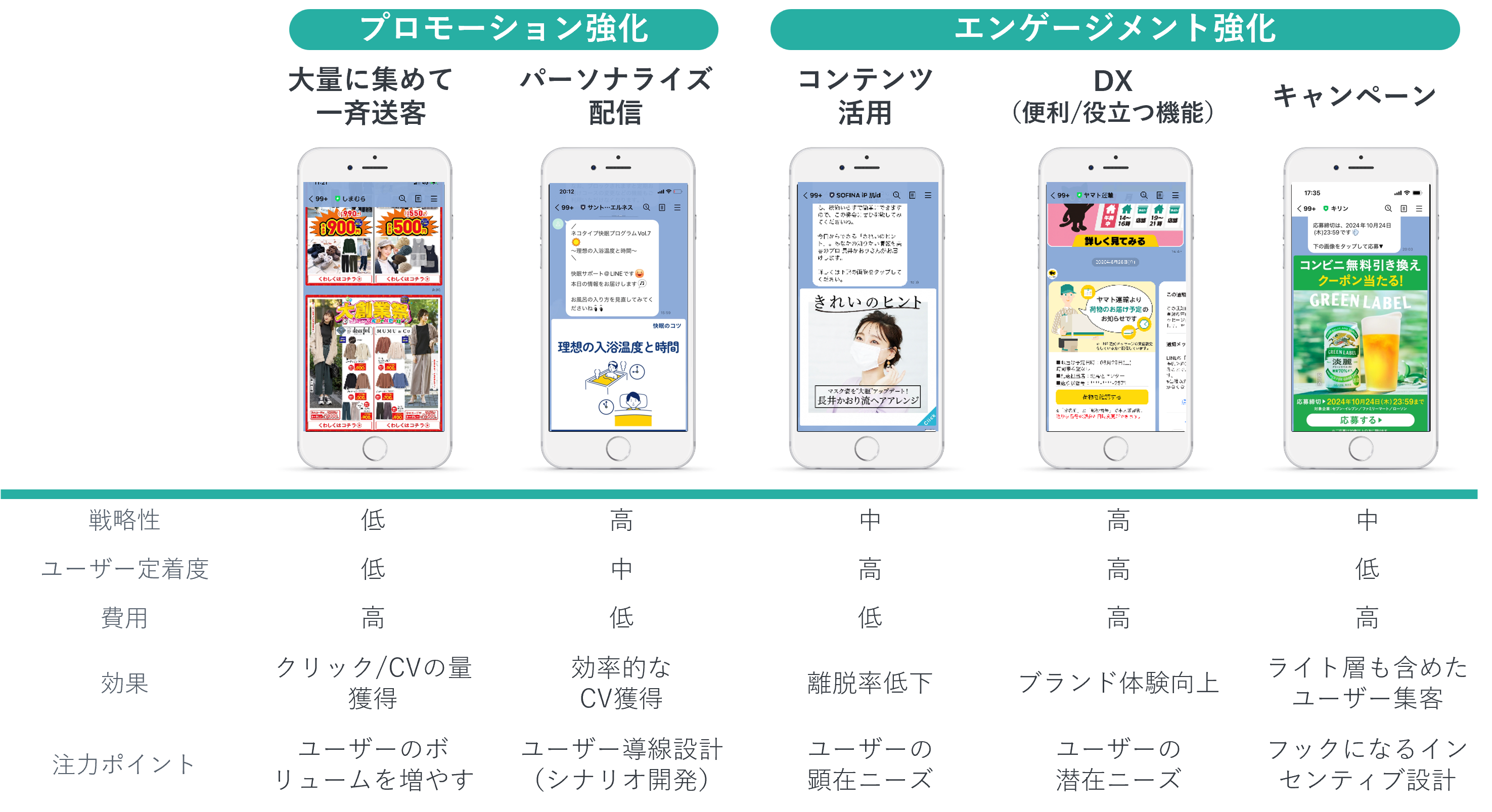 活用パターンは【プロモーション強化】の視点で2つ、【エンゲージメント強化】の視点で2つに分かれます。