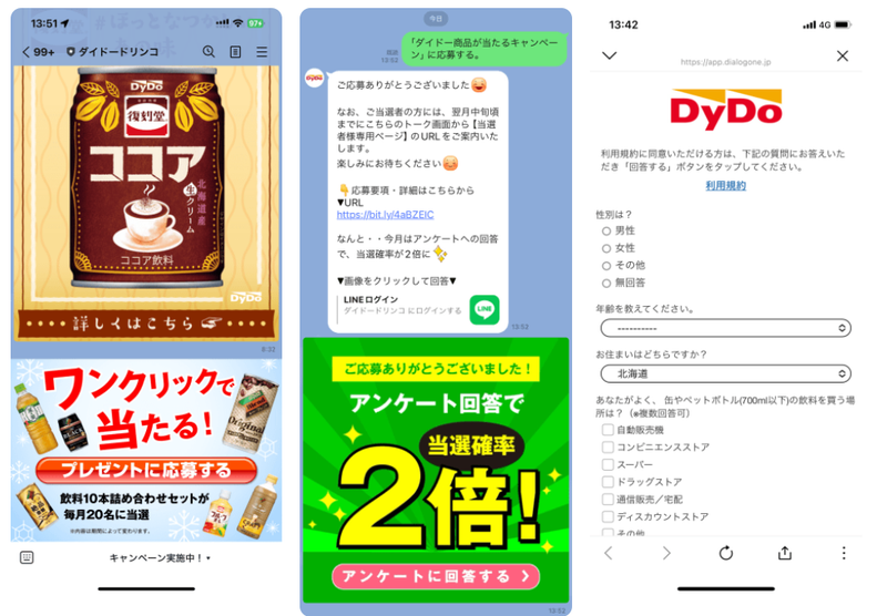 ダイドードリンコは、このアンケート機能を効果的に活用しています。アプローチのキーは、アンケートの設計が段階的になっていることです。まず、ユーザーがバナーをタップするだけでキャンペーン応募が完了します。この低い参加ハードルが、多くのユーザーを引き付けるポイントです。