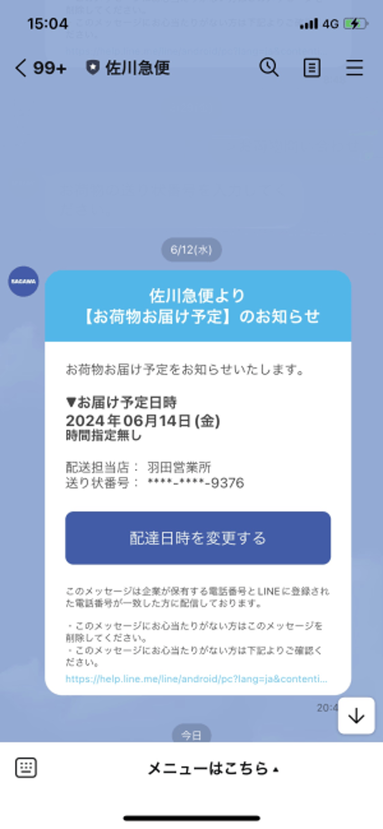 佐川急便では、荷物のお届け予定に関しての通知がLINEに届くようになっている。
