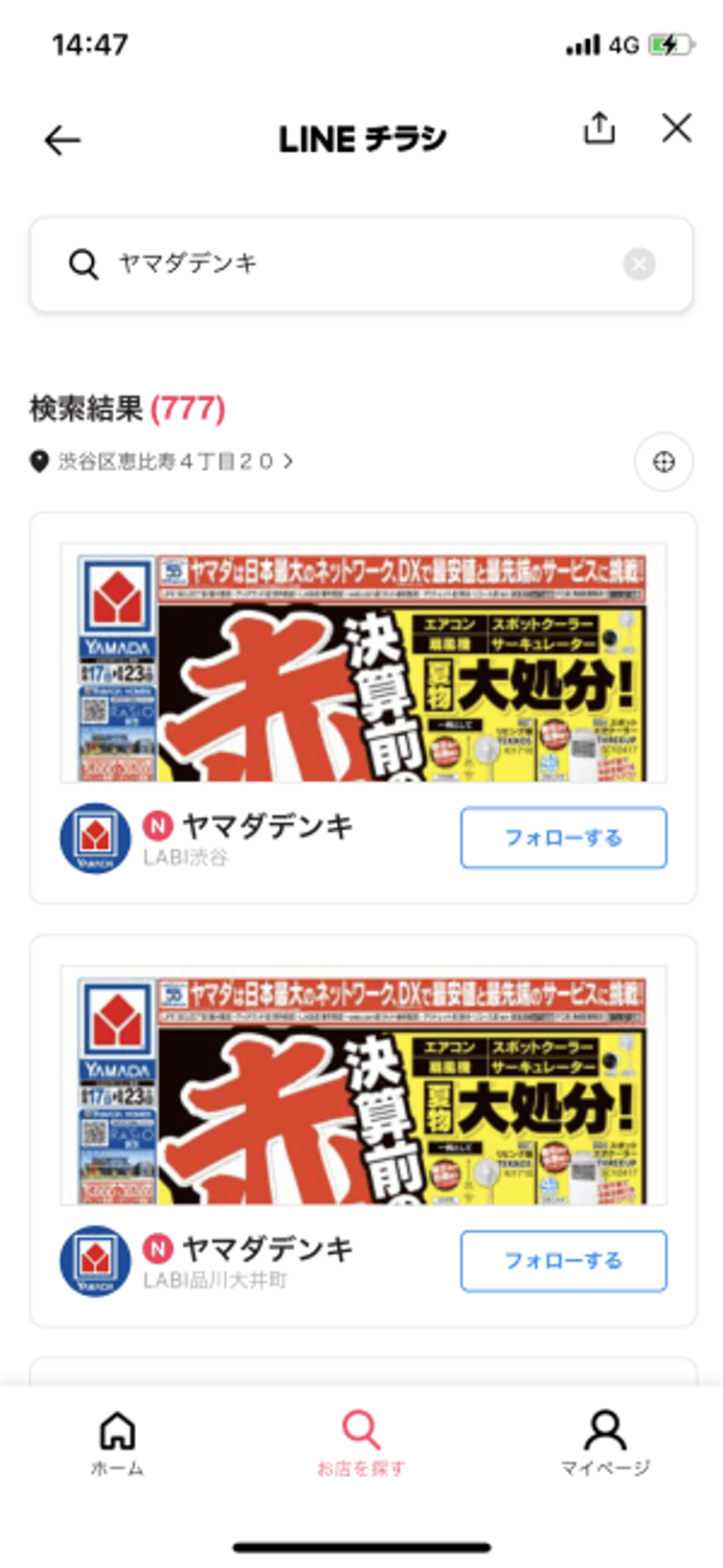 ヤマダデンキでは、LINEチラシを活用して、各店舗の情報が受け取れるようにしている。